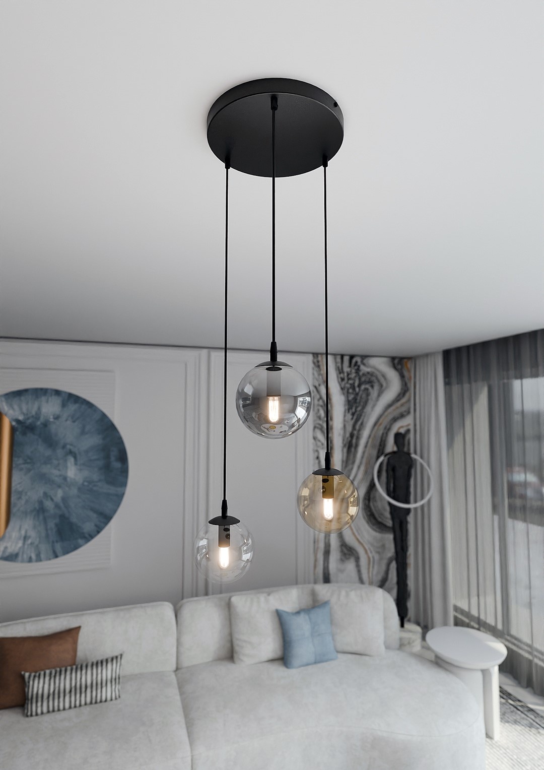 Die COSMO 3 BL PREMIUM MIX Pendelleuchte von Emibig ist die perfekte Wahl für stilbewusste Innenräume. Mit ihrem eleganten, modernen Design und der Kombination aus schwarzem pulverbeschichtetem Stahl und transparentem Glas sorgt sie für eine angenehme Atmosphäre.