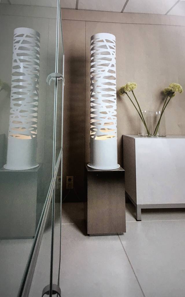 Verfügt über eine Design-Stehlampe mit weißen Öffnungen und einer Höhe von 139 cm