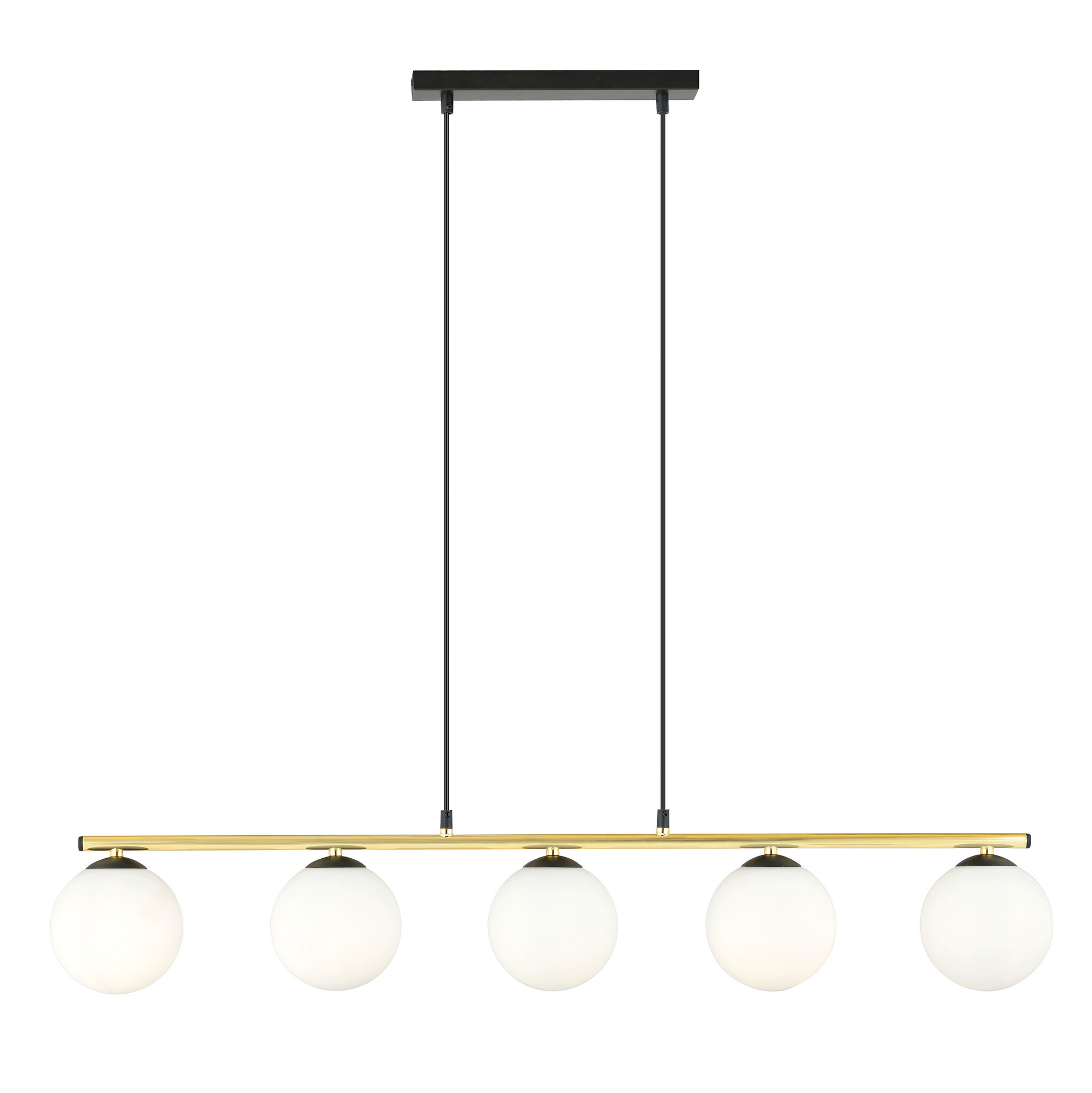 Enorm lange Hängelampe aus Schwarz und Messing mit 5x E14-Milchglasbirnen