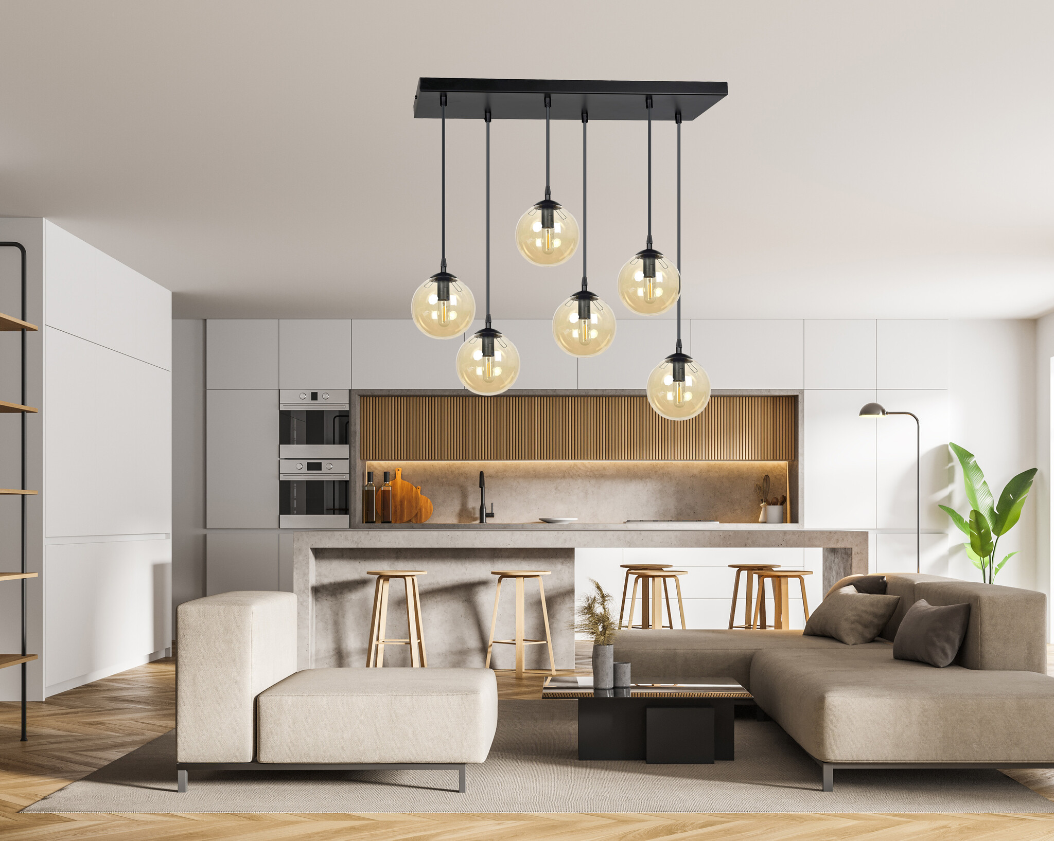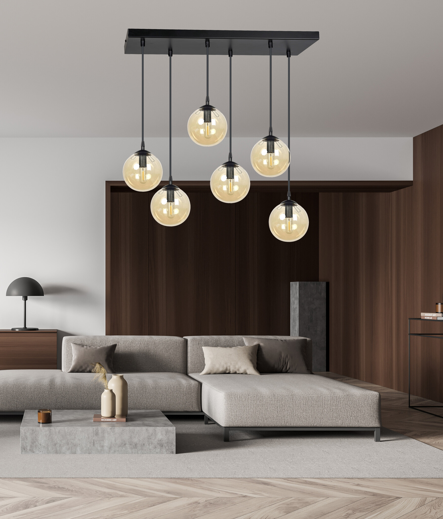 Spezifikationen Glostrup breite schwarze 6-flammige Hängelampe mit bernsteinfarbenem Glas für E14-Lampen: