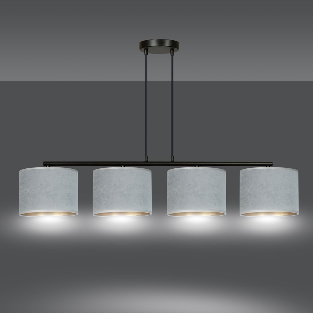 Die HILDE 4 BL GRAY Pendelleuchte von Emibig ist die perfekte Wahl für moderne Wohnräume. Mit ihrem schlichten, eleganten Design und der Kombination aus pulverbeschichtetem Stahl und einem grauen Stoffschirm bringt sie eine stilvolle Atmosphäre in Ihr Zuhause.