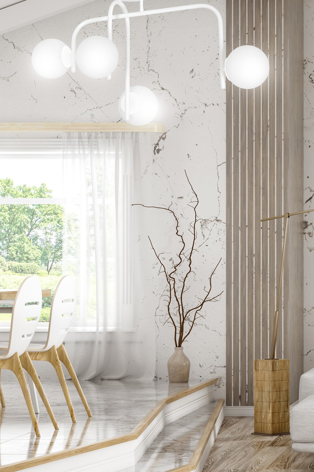 Die KALF 4B Deckenlampe von Emibig ist die perfekte Ergänzung für jeden Raum. Mit ihrem eleganten, weißen Finish und der Kombination aus pulverbeschichtetem Stahl und Glas bringt sie eine moderne Atmosphäre in Ihr Zuhause.