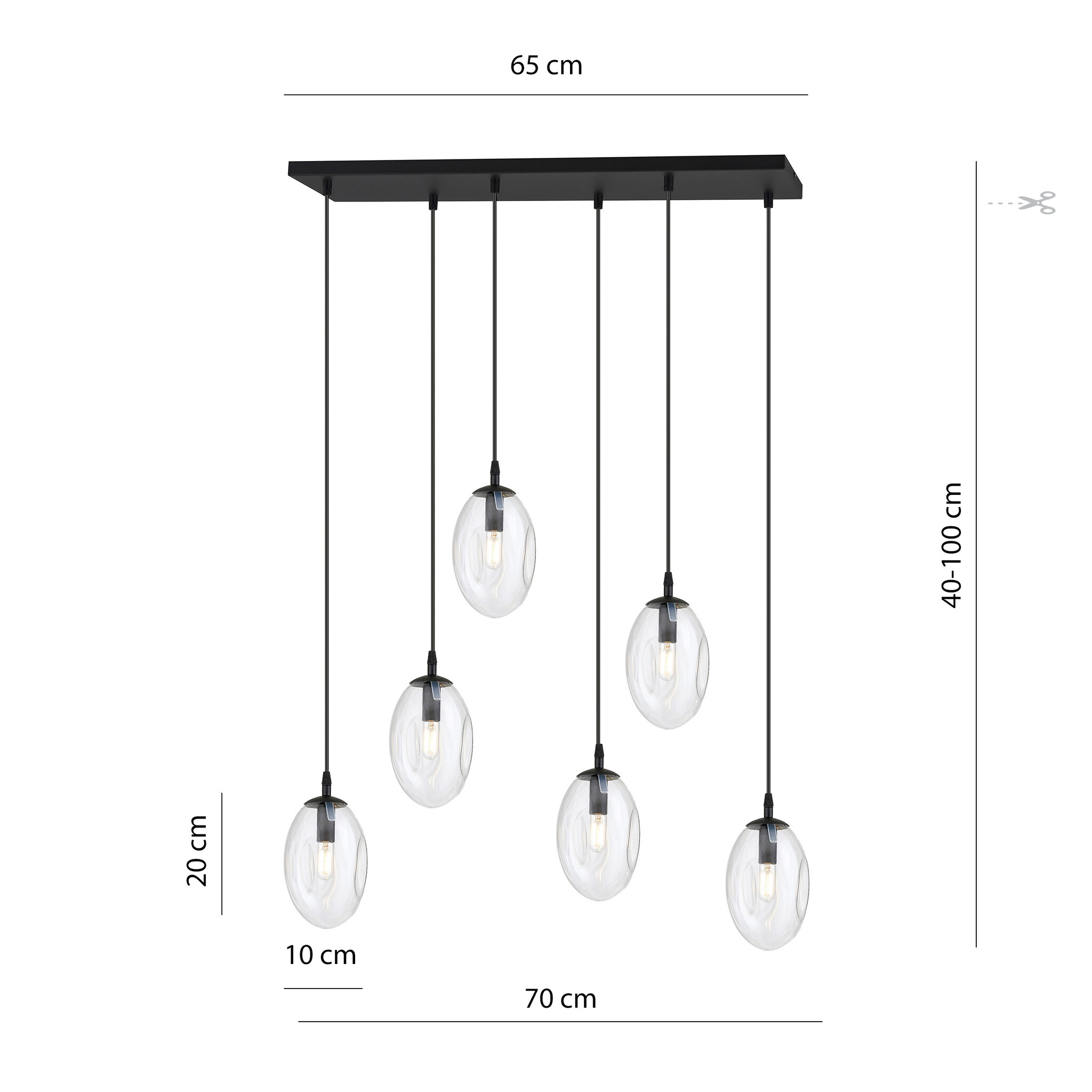 Spezifikationen: Lange 6 hellschwarze Pendelleuchte mit 6 Gläsern aus mundgeblasenem transparentem Glas: