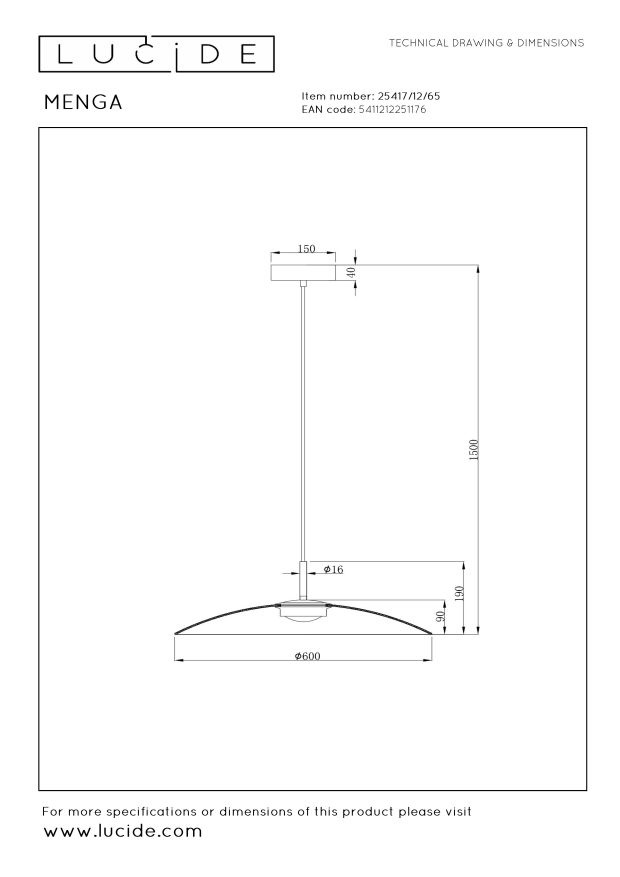 Spezifikationen Lucide MENGA – Hängelampe – Ø 60 cm – LED-Dimmung. - 1x18,6W 2700K - Fumé:
