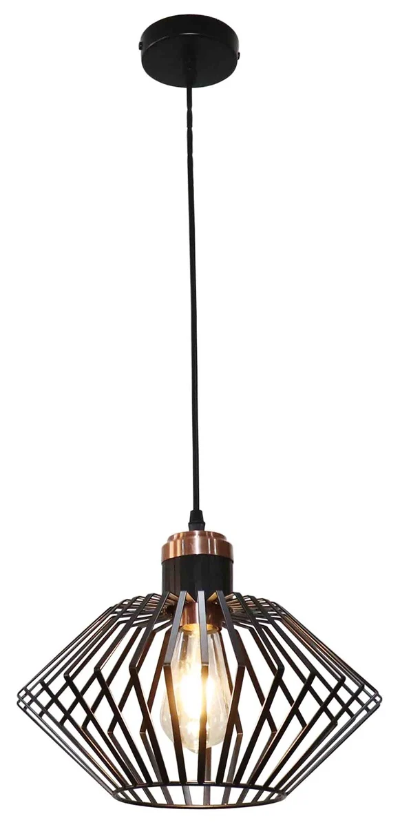 Schwarz mit kupferfarbenem Metallkäfig, Pendelleuchte, Rautenform, E27