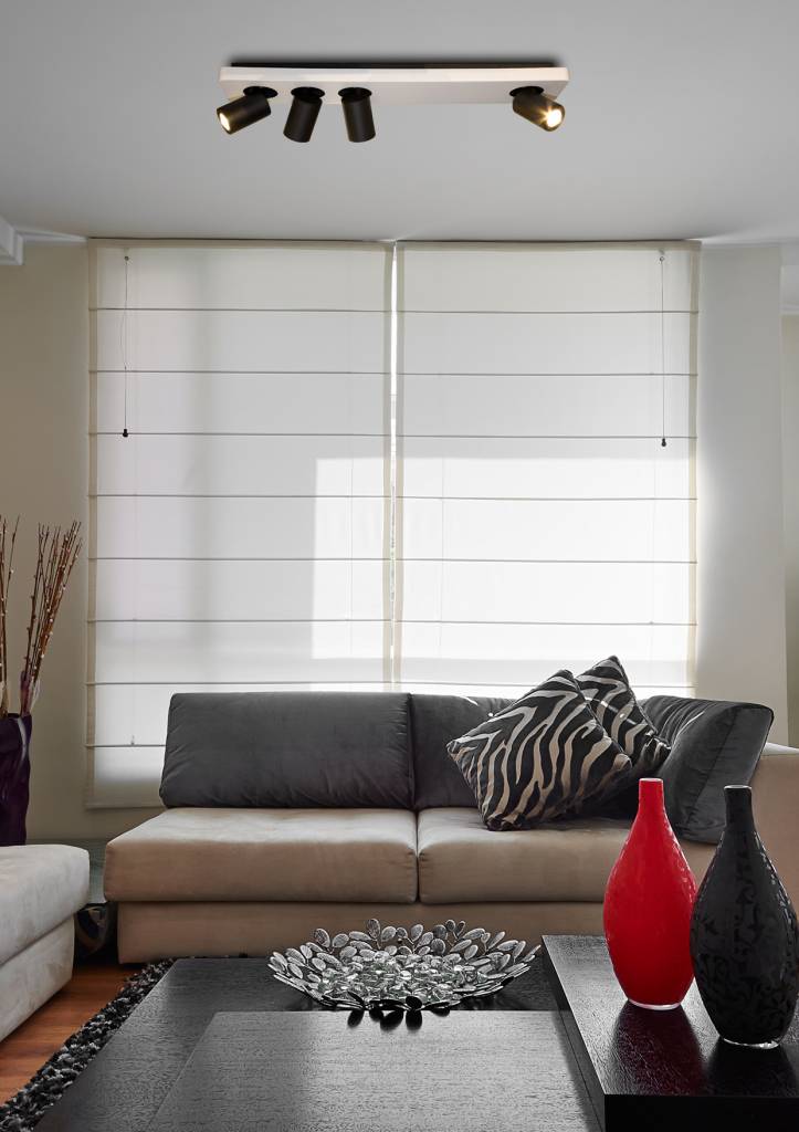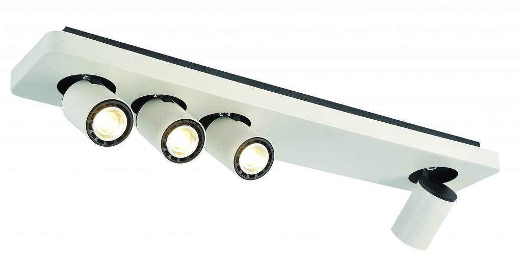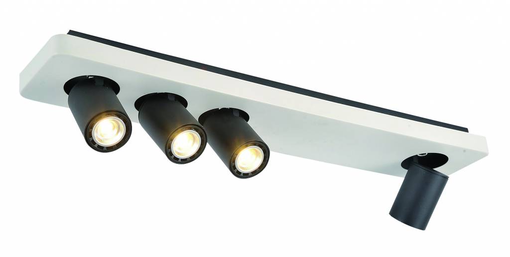 This designer black and white adjustable LED ceiling lamp, GU10 4x4.5W, 650mm wide, is very practical with its four spotlights. Its elongated shape and the fact that one spotlight is separate create a unique design. Since all the spotlights are adjustable, you can, for example, have all three shine in one direction and the individual spotlights in another. Or you can have them all shine in different directions. The possibilities are endless! The most common applications for this designer ceiling lamp are: as a dining table lamp, kitchen lighting, but also for living room, office, or shop lighting.