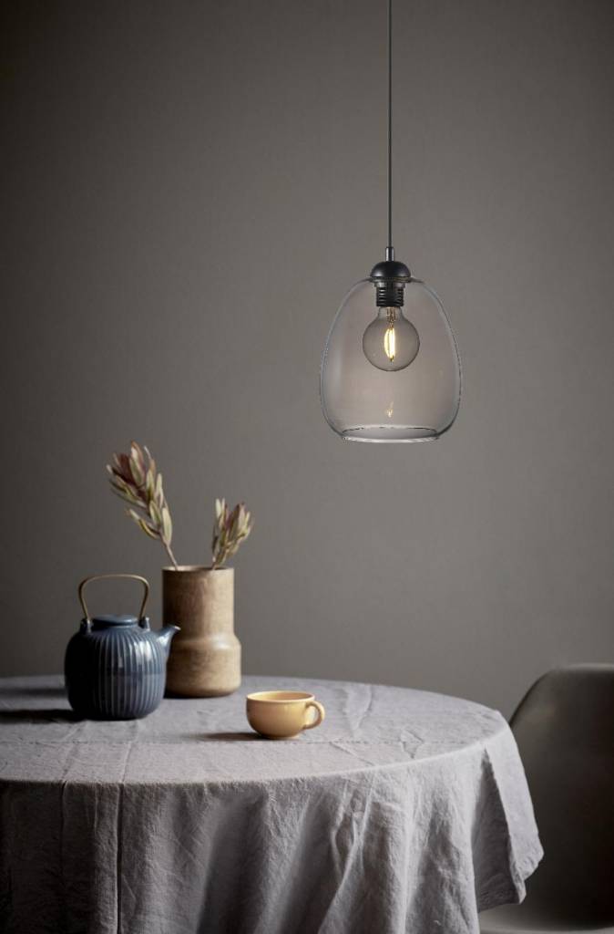 This dining table lamp is made in smoked glass and has a nice, rounded shape. Inside there is room to place an E27 lamp. A bulb lamp was used on the example. The combination of the long shape with a large, round bulb lamp comes out nicely. You can also order it from us. View our related products for this.