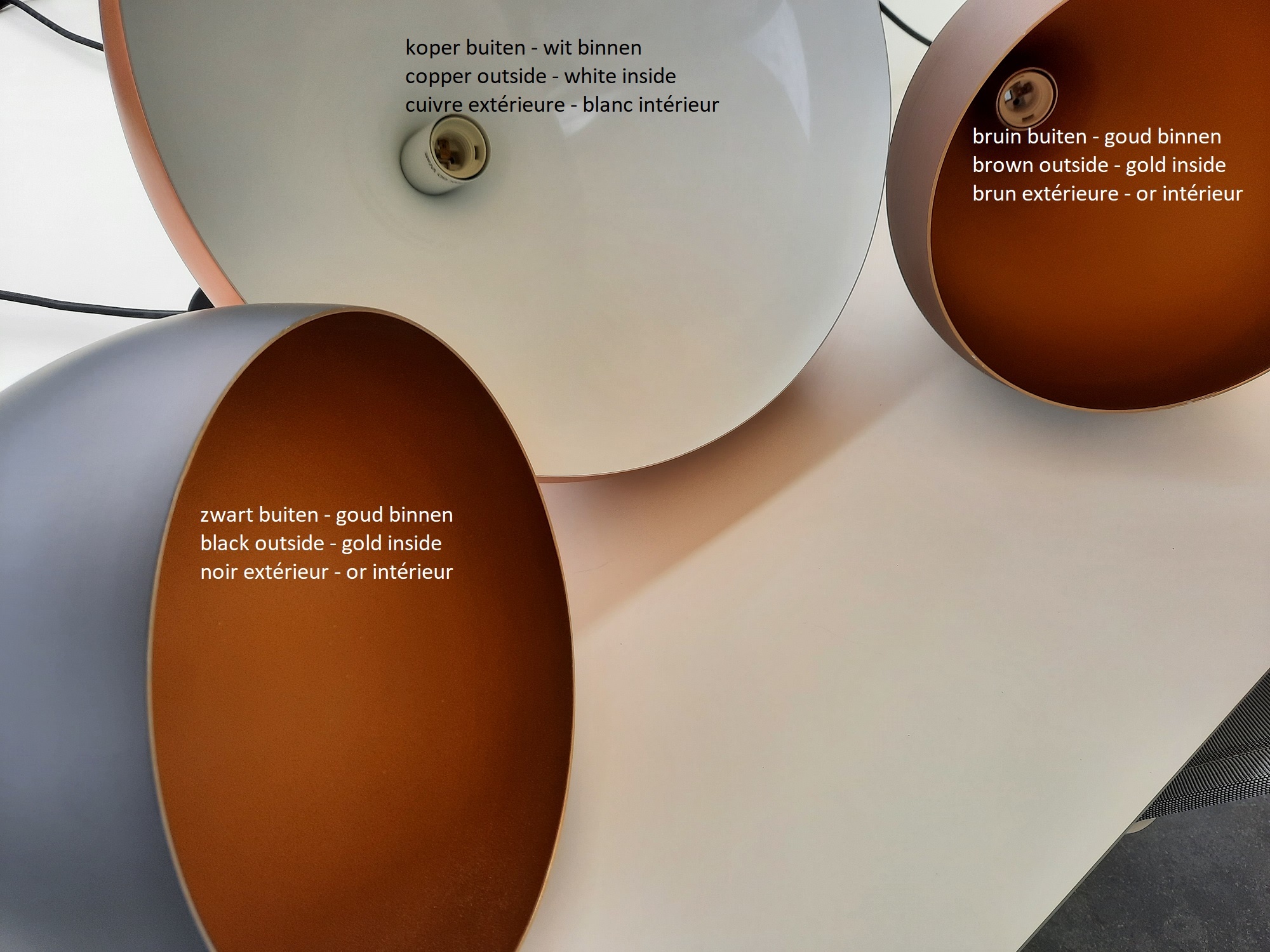 This atmospheric pendant lamp is available in three colors: black, copper, or coffee brown. For a warm and cozy atmosphere, the black or coffee brown version has a gold/amber interior. You can install an LED bulb with an E27 base inside.