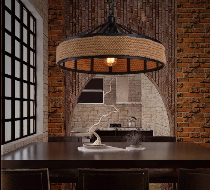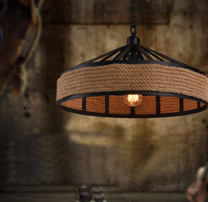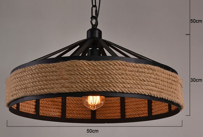 This industrial hanging lamp has a rope around the lampshade and is also hung via a rope that is approximately 70 cm long.