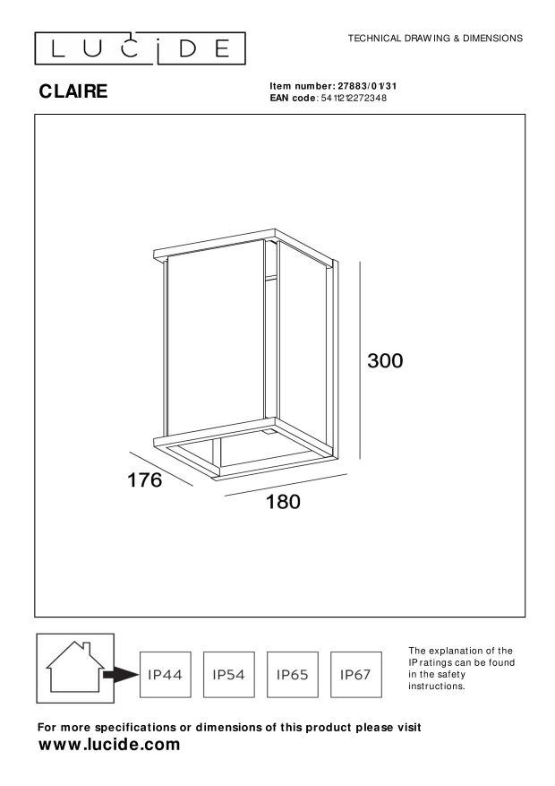 Specifications Lucide CLAIRE - Wall lamp Indoor/Outdoor - 1xE27 - IP54 - White: