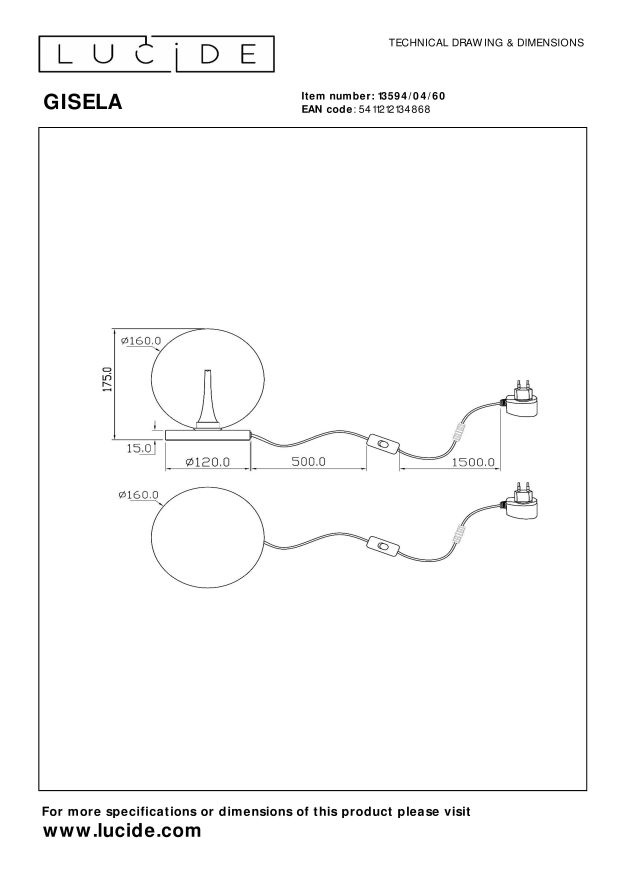 Specifications Lucide GISELA - Table lamp - Ø 16 cm - LED Dimb. - 1x5W 2700K - Transparent:
