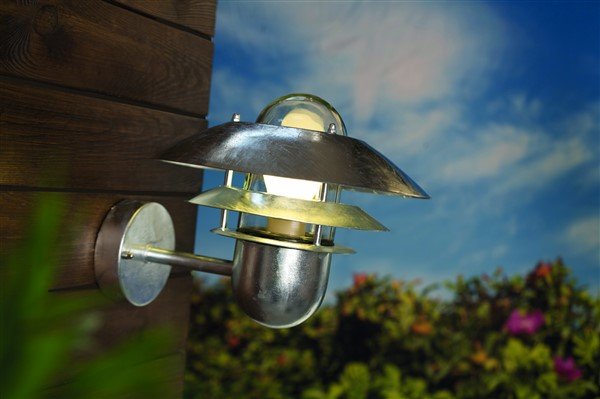 This outdoor wall light fixture metal IP54 E27 240mm high is made in galvanized metal. It has an E27 fitting in which fits a LED lamp E27 (see our related products for this).