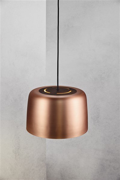 The lampshade is available in black or copper (the top is finished with oiled walnut). The matter is metal.