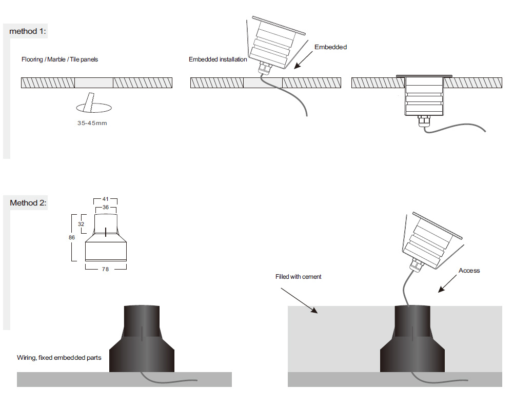 3W Mini Led Recessed Spotlight Voltage: DC10-30V Wattage: 3W Lumens: 240Lm CRI:>80Ra PF:>0.95 Colour?: WW/NW/CW Beam angle: 45° IP Class: IP67 Dimensions: Ф45×H40mm (installation depth at least 57mm!) Hole size: Ф34 to 42mm Material: 304 Stainless Steel + 6063 Aluminum Guarantee: 3 years |