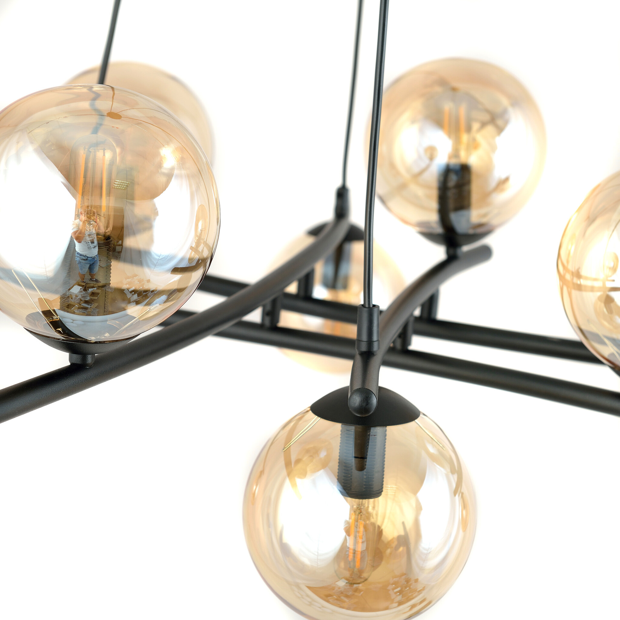 Stylish large black hanging lamp with 8 amber-coloured glass balls E14