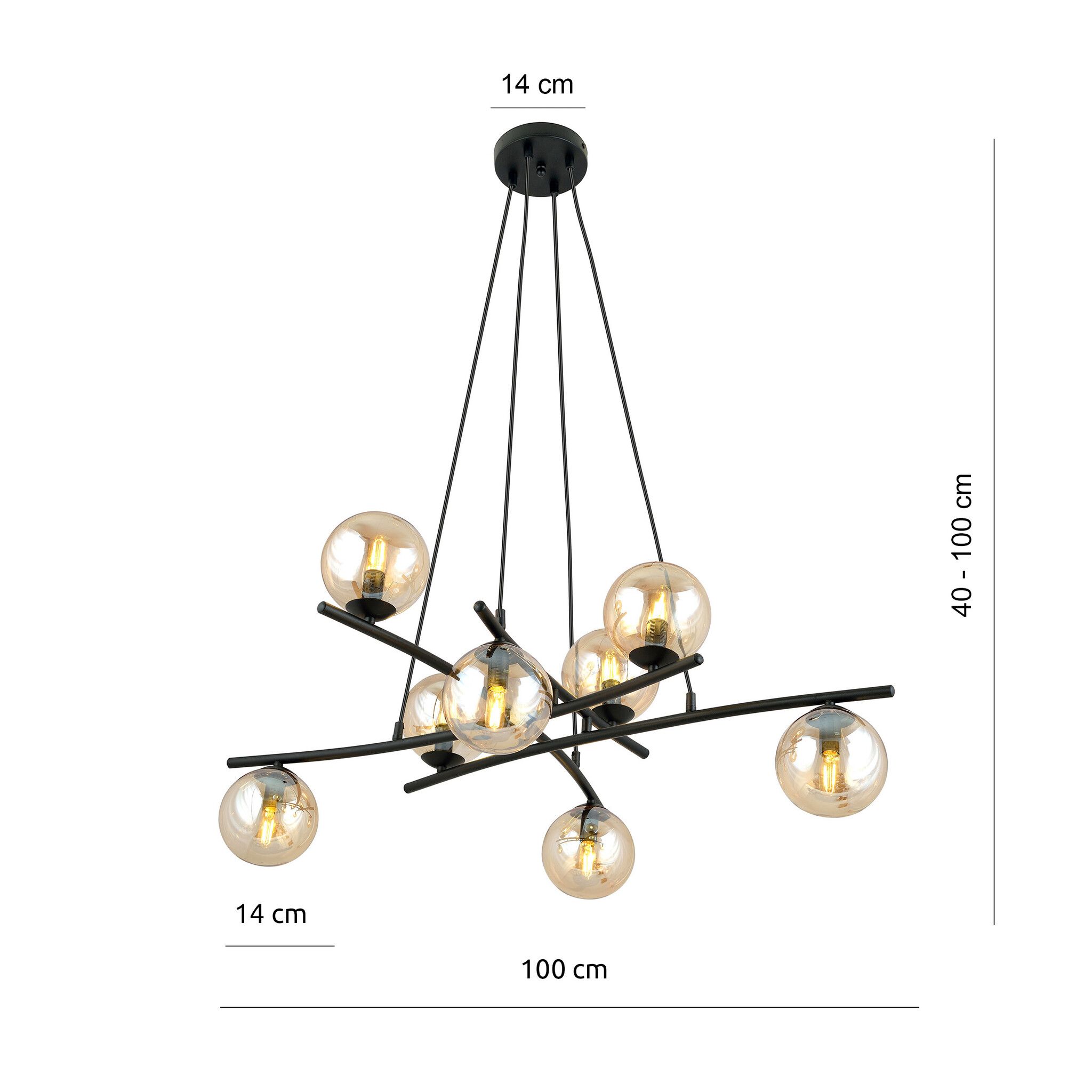 Specifications stylish large black hanging lamp with 8 amber-colored glass balls E14: