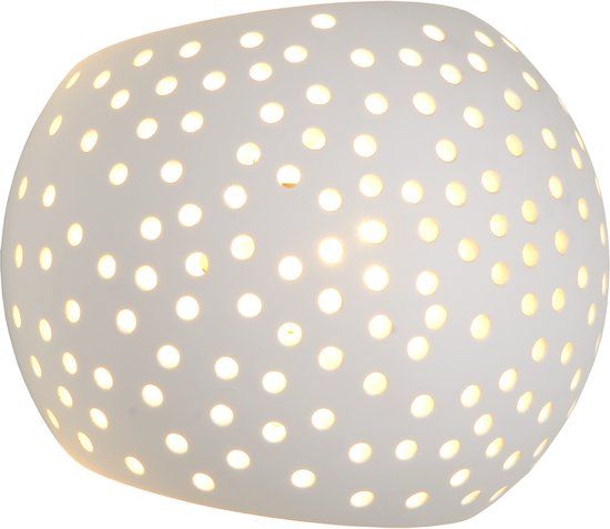 Este aplique de diseño está fabricado en yeso y es de color blanco y tiene forma ovalada. Está equipado con un casquillo G9 en el que se puede colocar una luz LED.