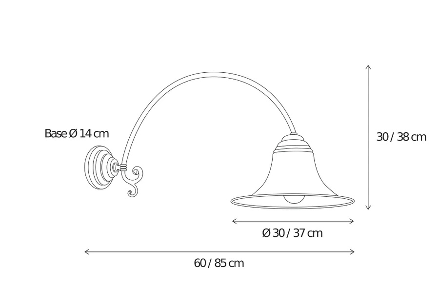 Las dimensiones de este aplique de exterior rural arco bronce E27 de 85cm de fondo son: alto (desde el fondo de la campana hasta el punto más alto de la varilla): 38cm, escala de diámetro: 37cm, fondo (desde la pared hasta el punto extremo): 85cm. También está disponible un modelo más pequeño (consulte nuestros productos relacionados).