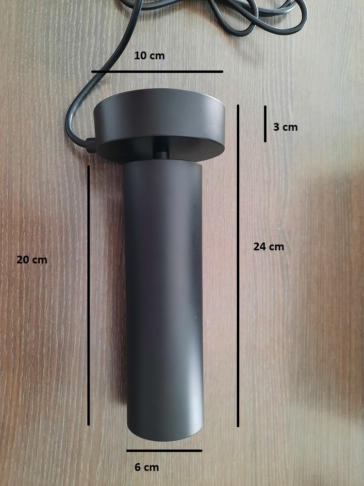 Las dimensiones son: altura 200 mm, profundidad 240 mm, diámetro de la pantalla de la lámpara 60 mm.