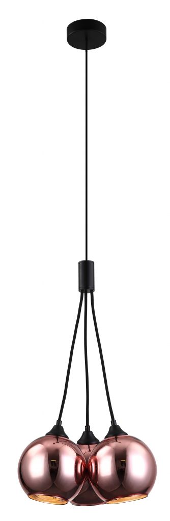 Esta lámpara colgante de 3 colgantes está disponible en oro rosa o cristal ahumado.