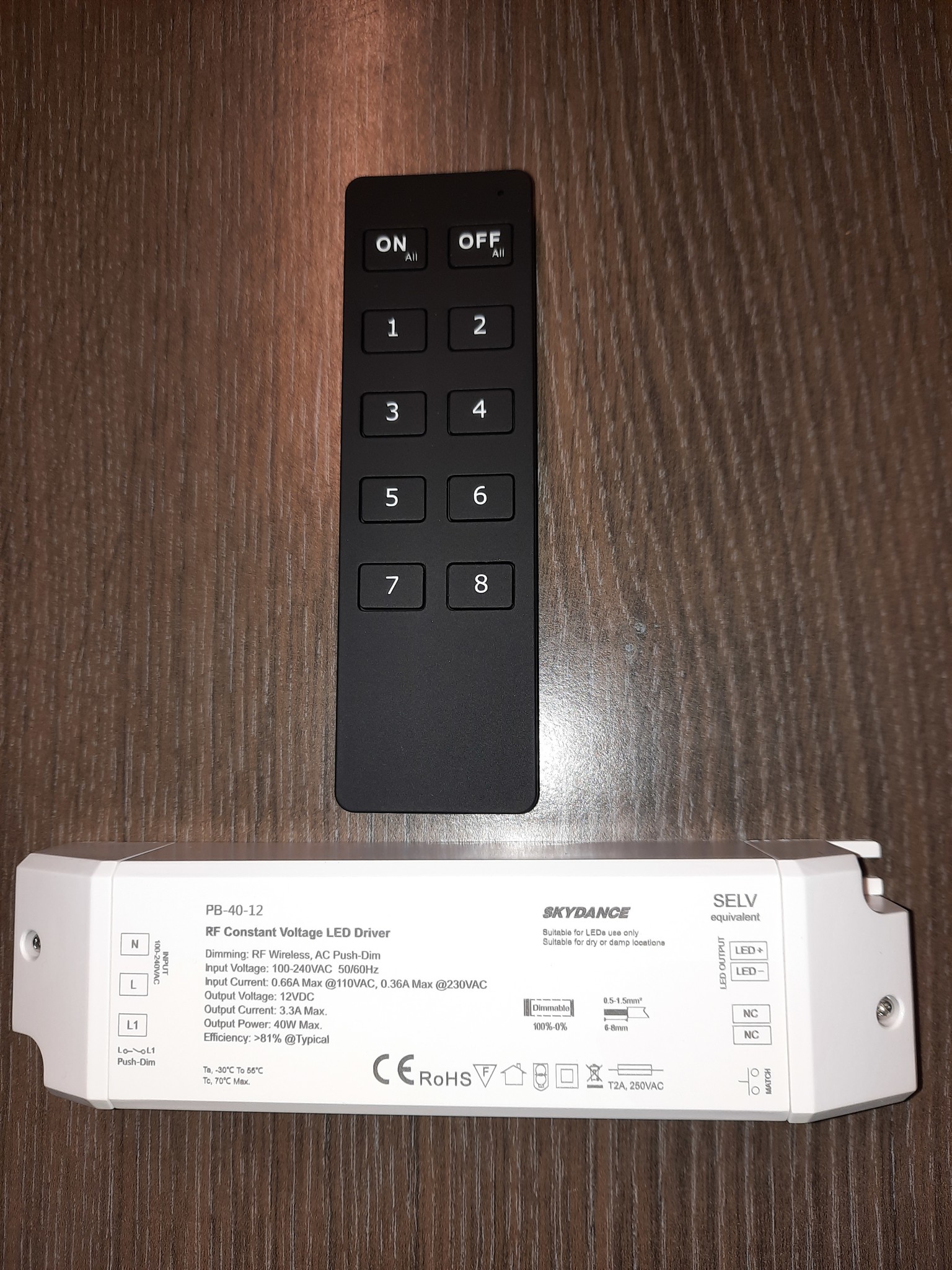 Especificaciones del controlador: regulable 24 V CC hasta 40 W, adecuado para habitaciones húmedas, posiblemente con control remoto: