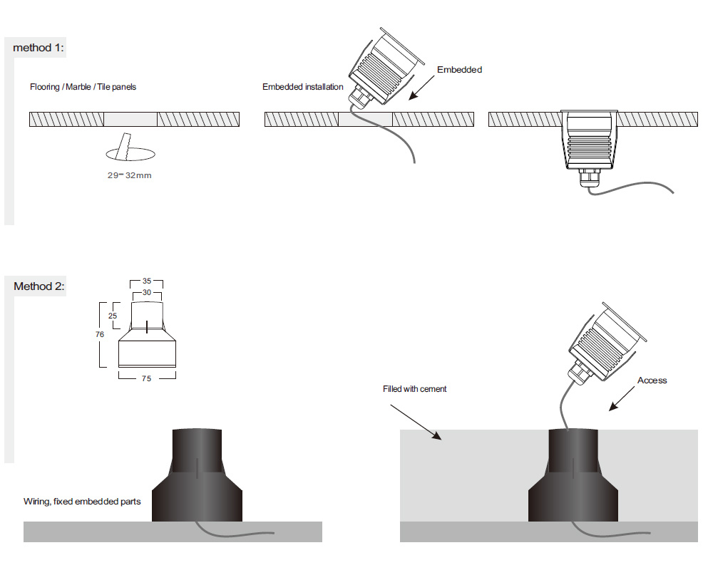 Foco Empotrable Mini Led 1W Voltaje: DC10-30V Potencia: 1W Lúmenes: 100Lm IRC: >80Ra FP:>0,95 ¿Color?: WW/NW/CW Ángulo de haz: 45° Clase IP: IP67 Dimensiones: Ф35×H38mm (profundidad de instalación de 53 mm como mínimo) Tamaño del agujero: Ф28mm Material: acero inoxidable 304 + aluminio 6063