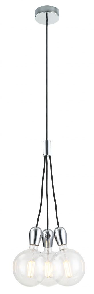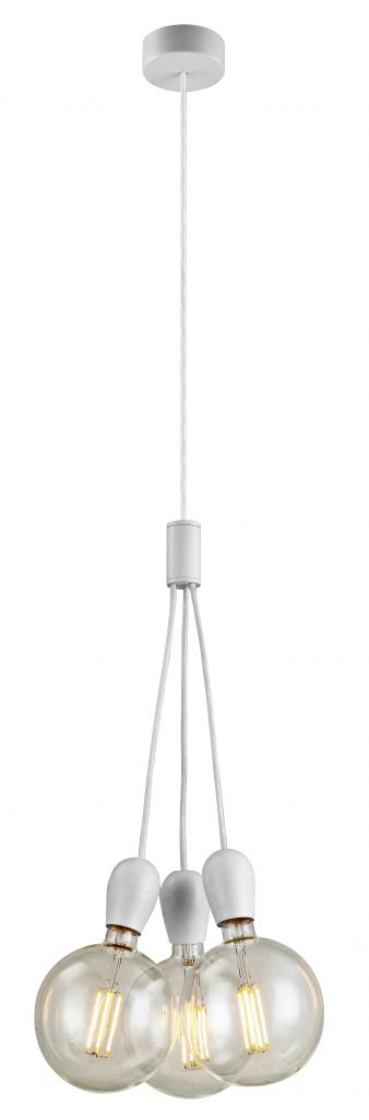 Esta lámpara colgante de 3 luces está disponible en blanco, negro o cromo.