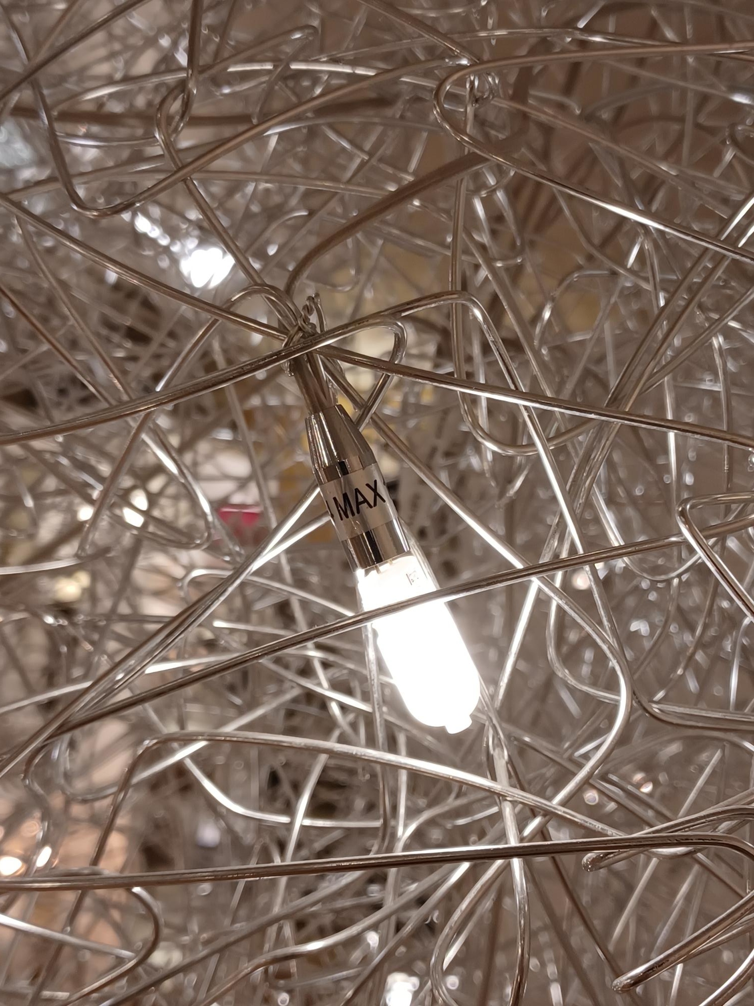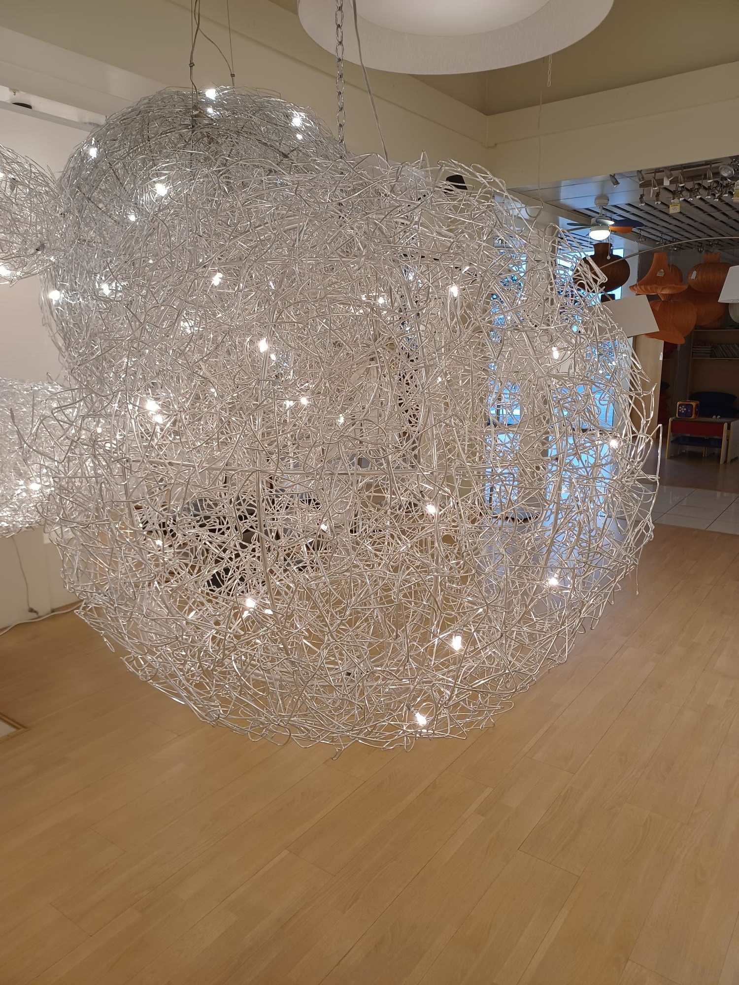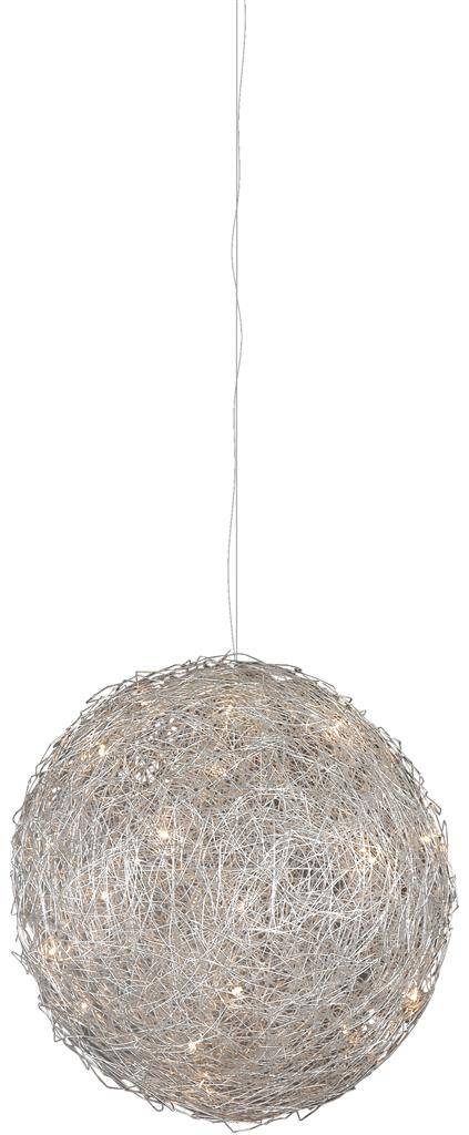 Esta lámpara colgante de bola está fabricada en alambre de acero (aluminio) y tiene un diámetro de 100cm. No hay menos de 20 puntos de luz en forma de lámparas halógenas G4 (que están incluidas). También está listo para usar con lámparas LED.