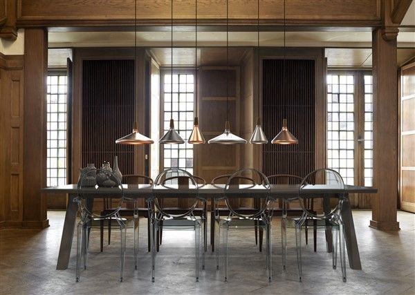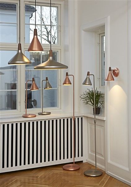 Esta lámpara colgante cónica está disponible en cobre cepillado o acero cepillado.