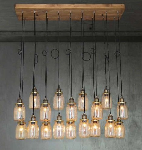 Esta lámpara colgante vidrio industrial madera E27x18 1300mm tiene un aspecto industrial único.Está equipada con no menos de 18 pantallas de lámparas colgantes de cristal en las que se integra un casquillo E27.