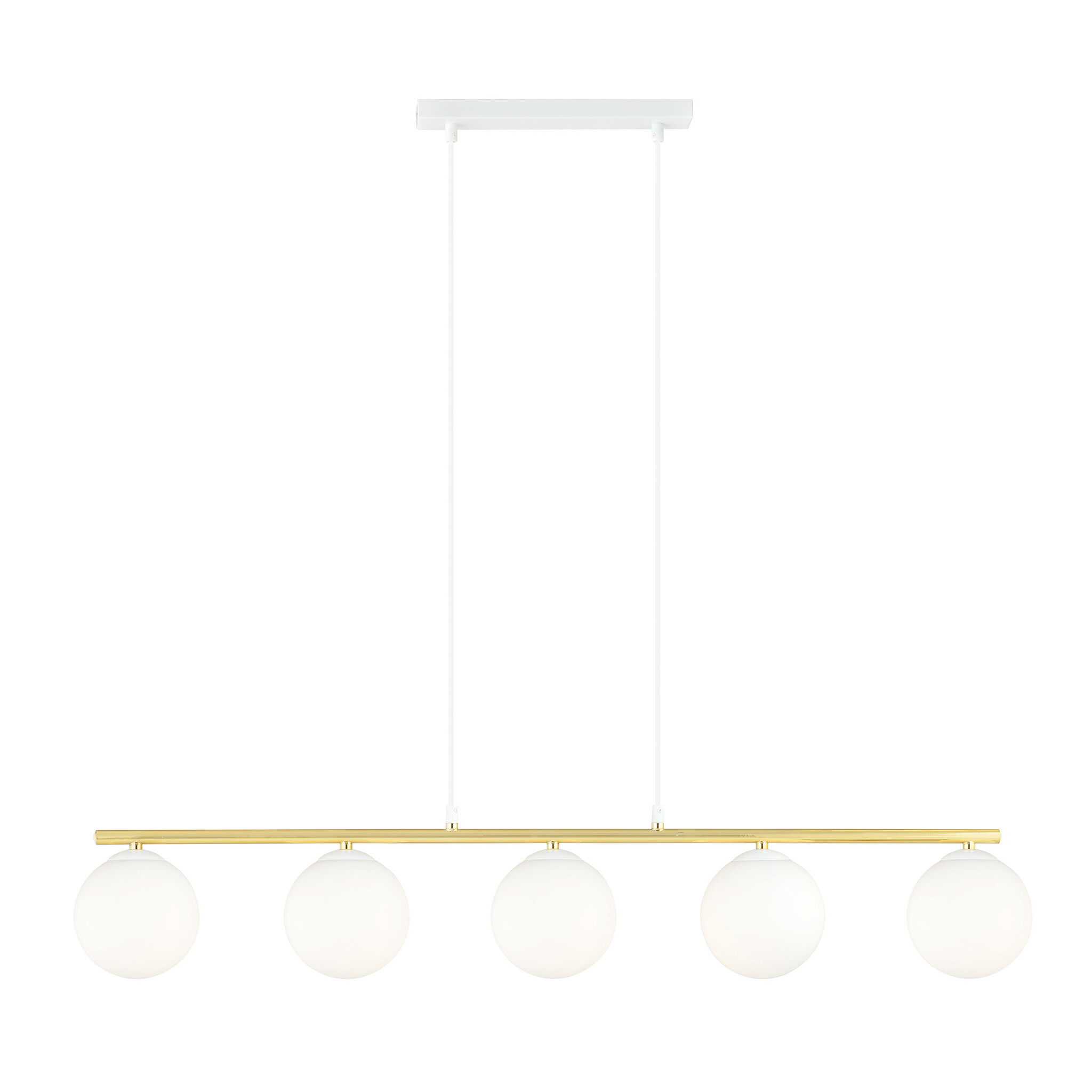 Lámpara colgante muy larga blanca y latón 5x E14 vidrio esmerilado
