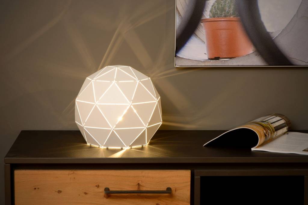 La lámpara de mesa geométrica se compone de varios triángulos pequeños que están bellamente conectados y acentuados por los pequeños espacios entre ellos.