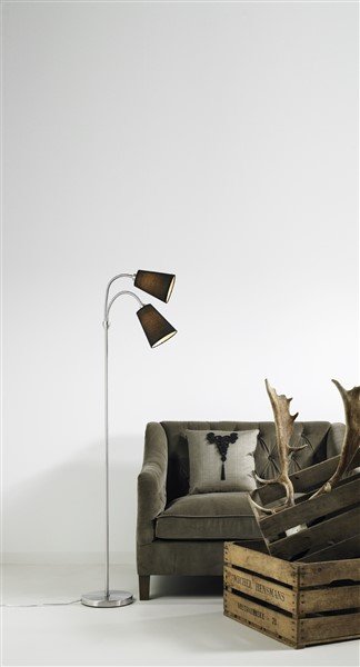 Esta lámpara de pie con luz de lectura tela negra 2xE14 de 1550mm de altura está fabricada en metal y dispone de 2 pantallas.