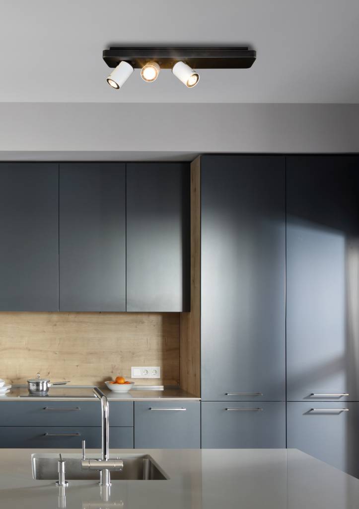 Debido a la presencia de 3 focos, este Plafón LED de diseño blanco y negro orientable GU10 3x4,5W 500mm de ancho tiene ventajas especiales. Al emitir tanta luz y ser orientable, se puede utilizar prácticamente en cualquier lugar. La mayoría de las aplicaciones son: como lámpara sobre la mesa del comedor, iluminación de cocinas, pero también para iluminación de salones, oficinas o tiendas.