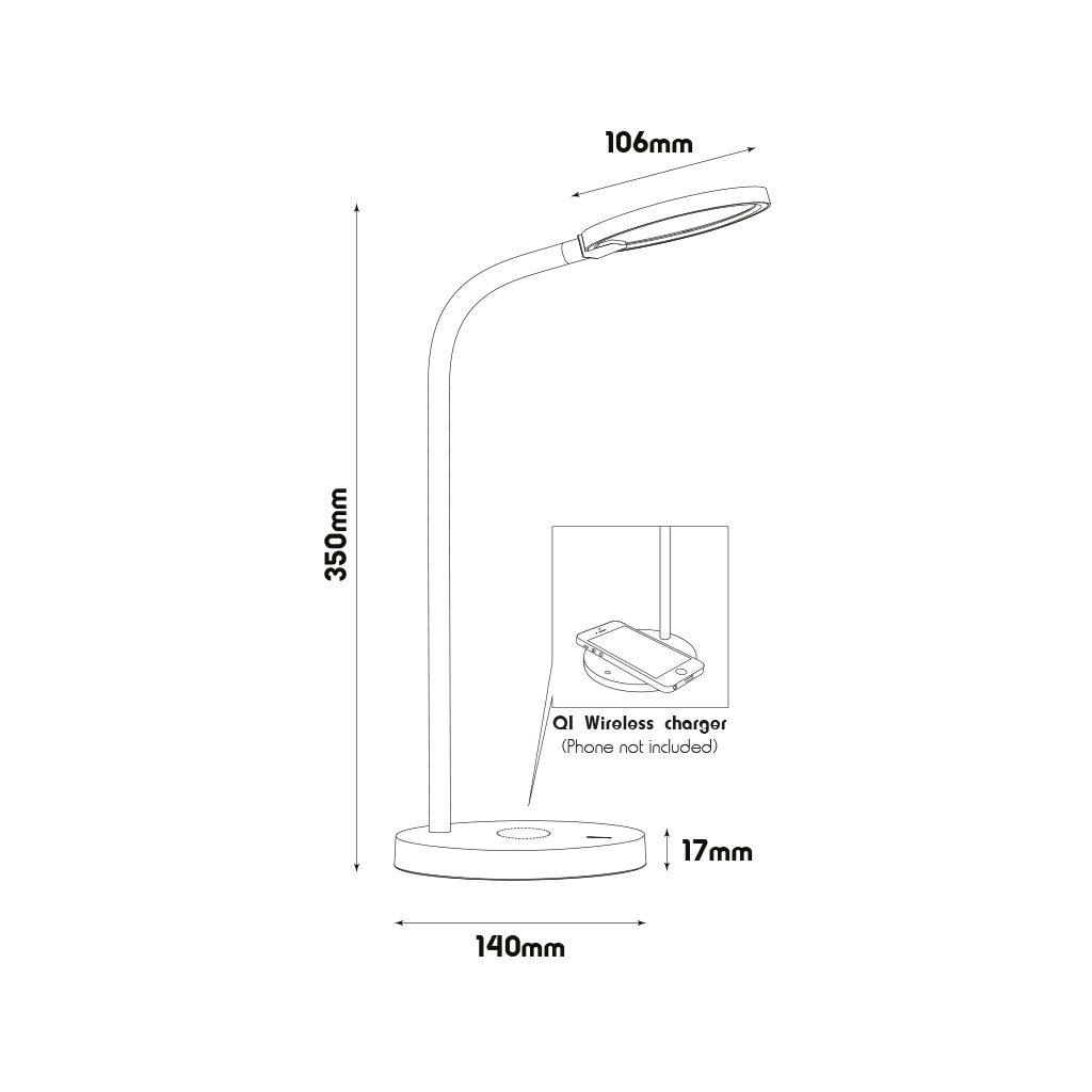 Lámpara de escritorio LED blanca Utrecht 5,5W regulable en 3 pasos + cargador QI blanco