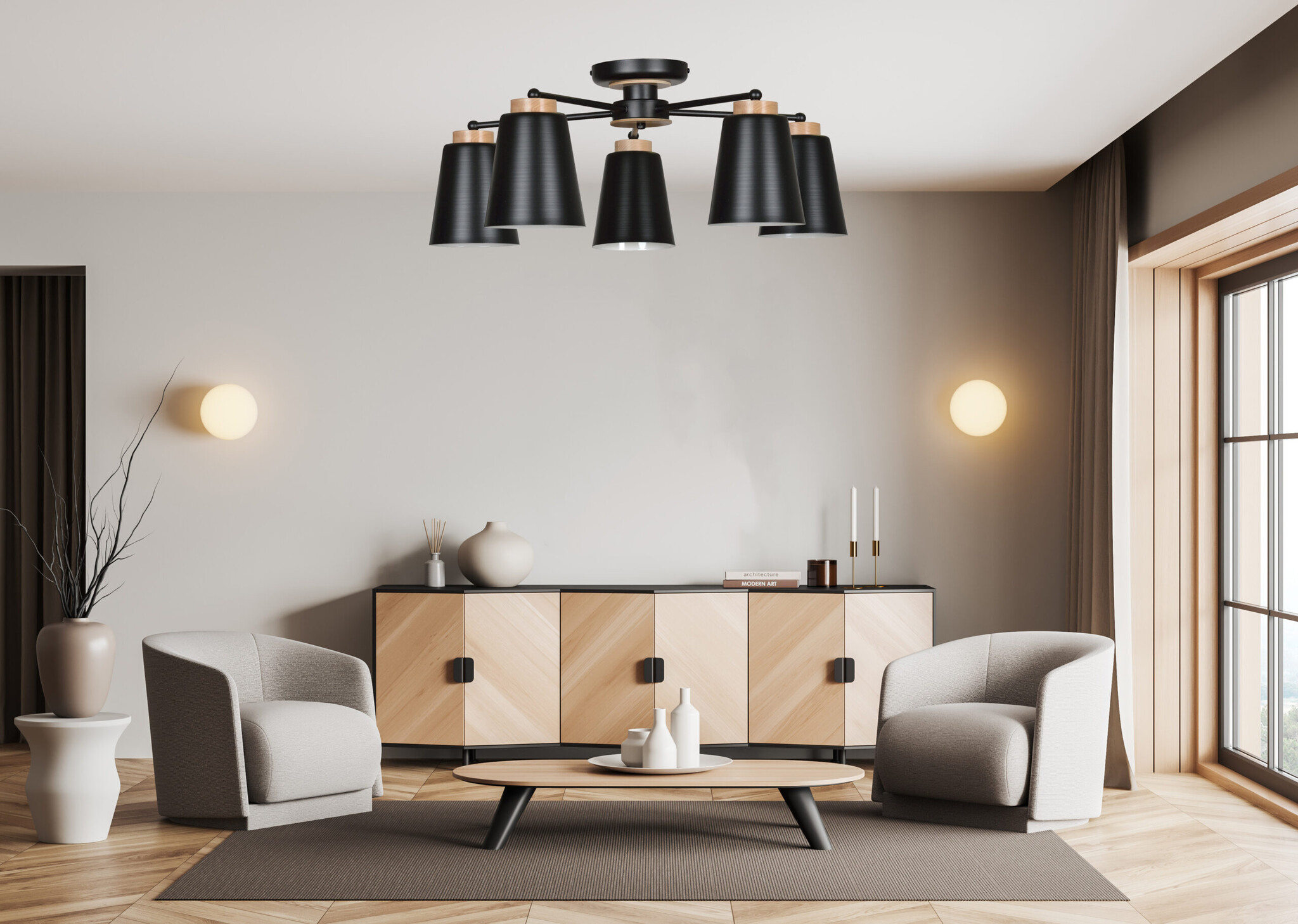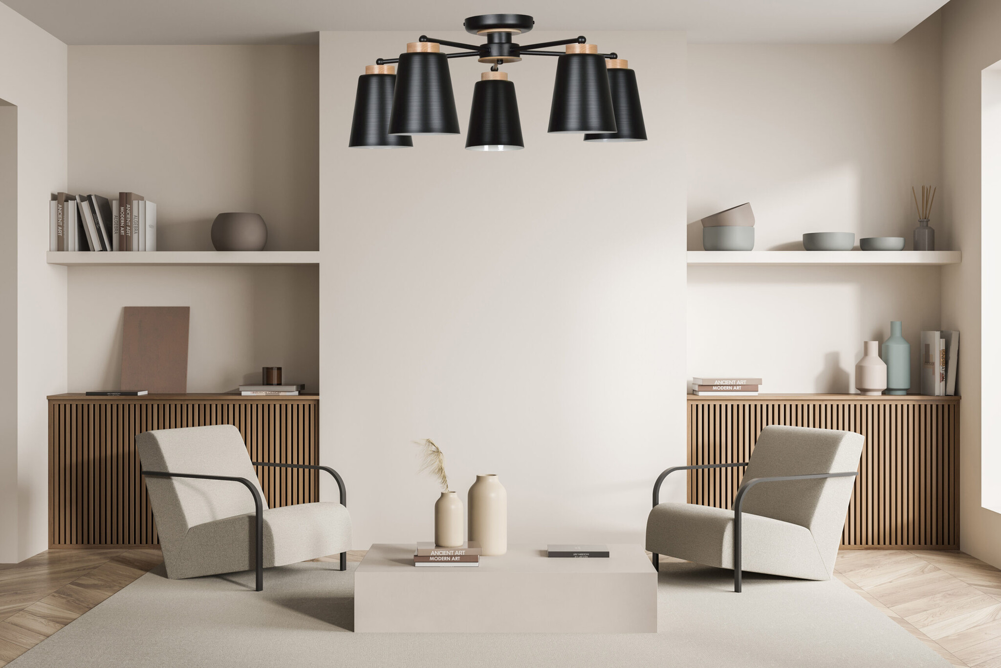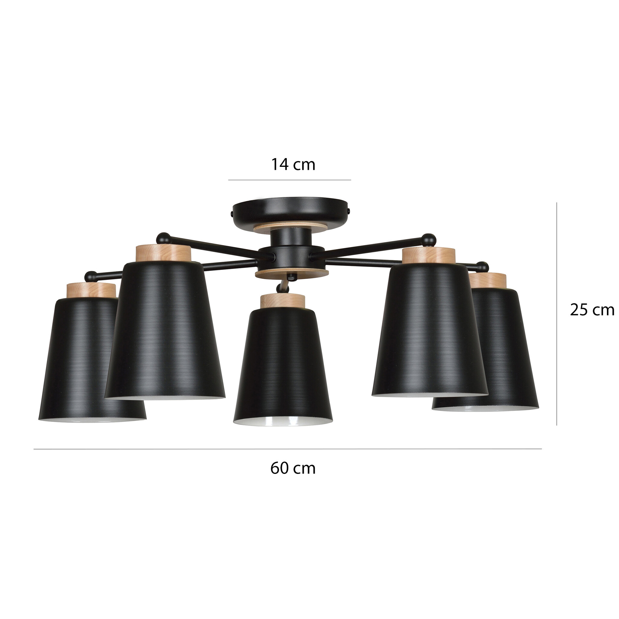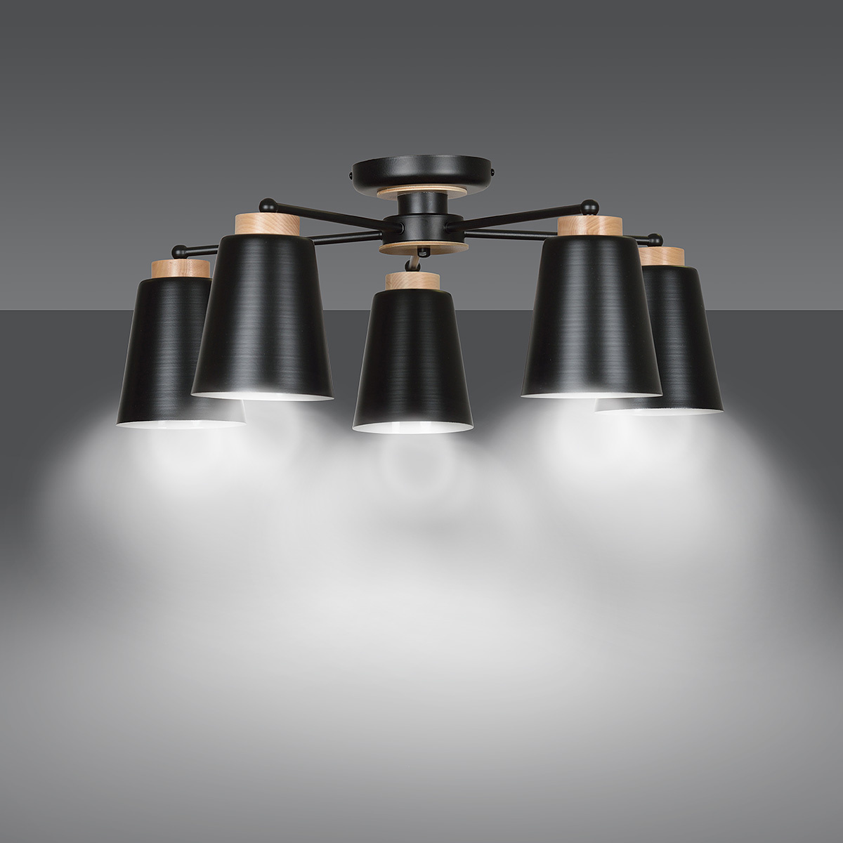 Linkoping Plafón 5L negro con madera 5 pantallas metal E27