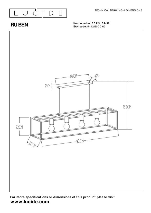 Especificaciones Lucide RUBEN - Lámpara colgante - 4xE27 - Negro: