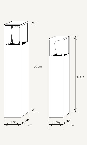 Este poste de iluminación para jardín rural de bronce, cromo y níquel de 60 cm de alto tiene las dimensiones: 600 mm de alto, 100 mm de ancho y 100 mm de profundidad.