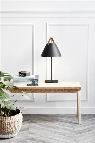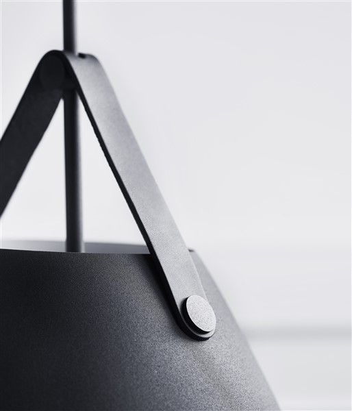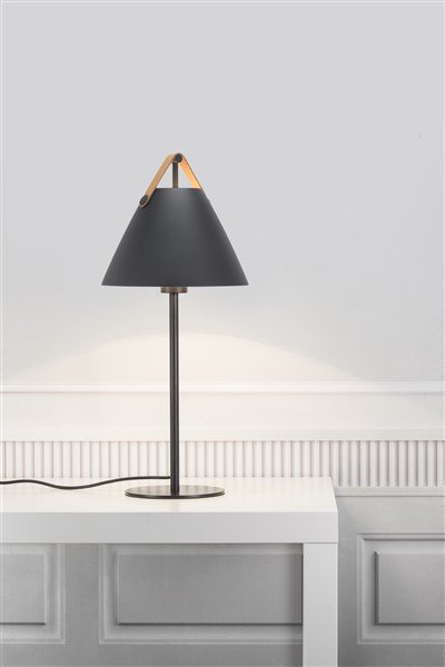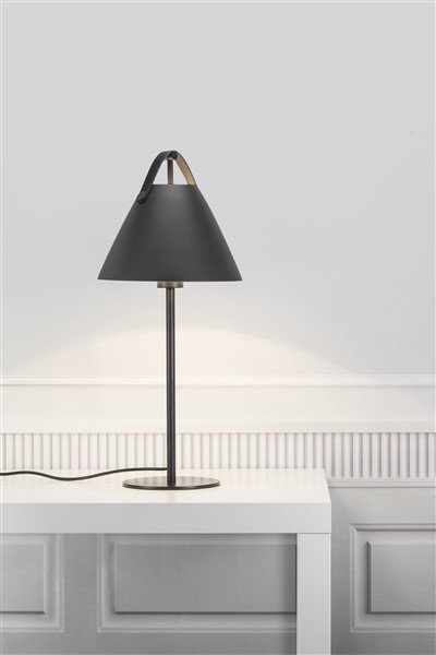 Esta lámpara de mesa de estilo escandinavo consiste en una barra tensora con una pantalla adjunta. La pantalla está bellamente colgada por medio de un soporte de cuero.