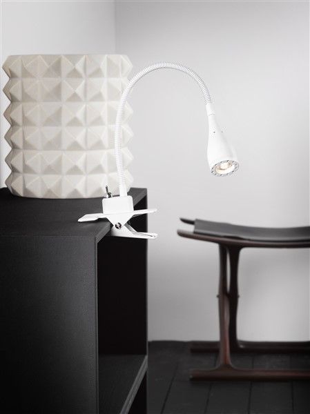 Esta lámpara de escritorio con pinza tiene un módulo LED integrado de 3W. La luz es de color blanco cálido (3000 Kelvin) y la intensidad luminosa es de 130 lúmenes.