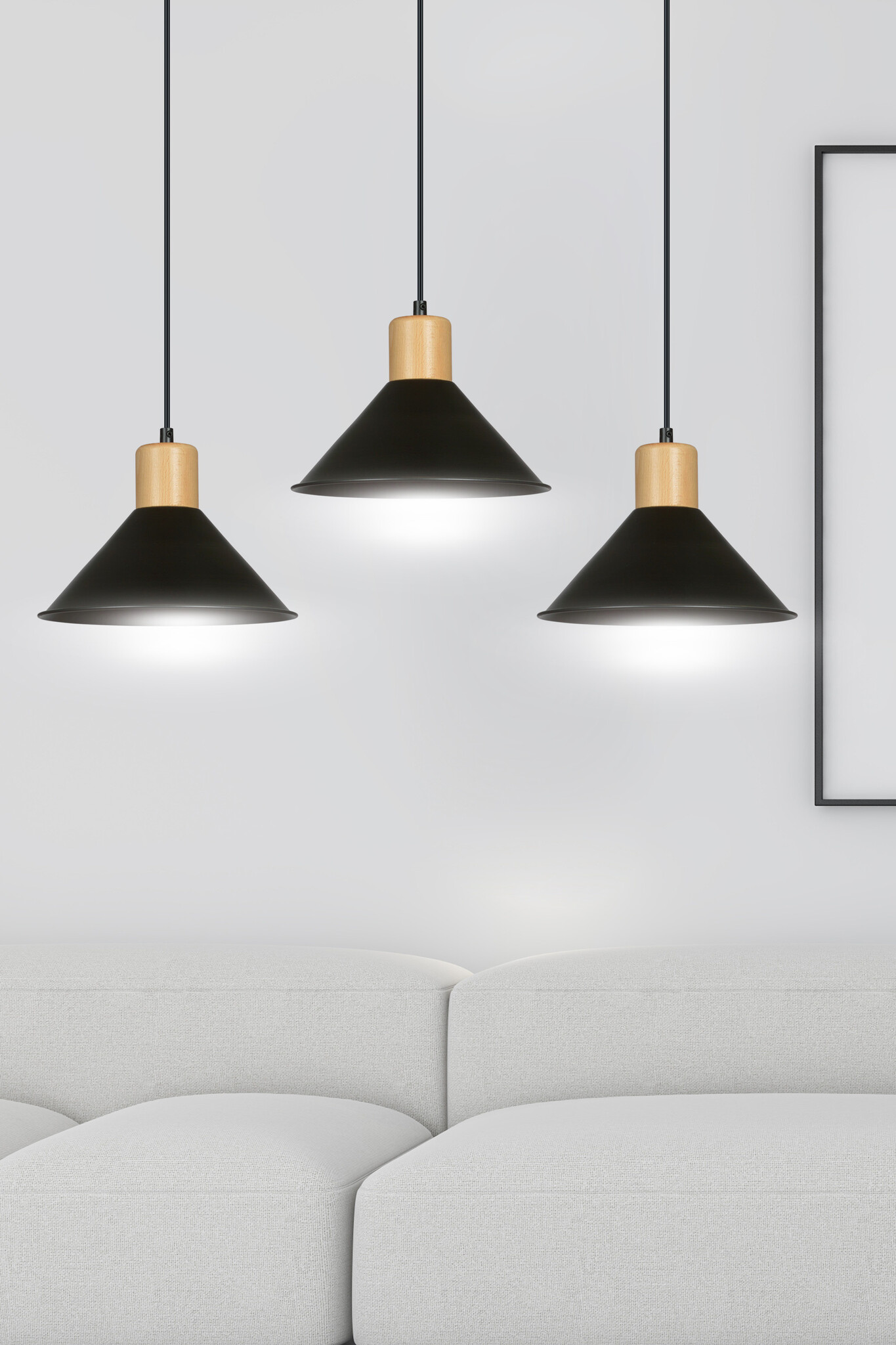 Vejen lámpara colgante larga negra con madera 3x E27 pantallas cónicas
