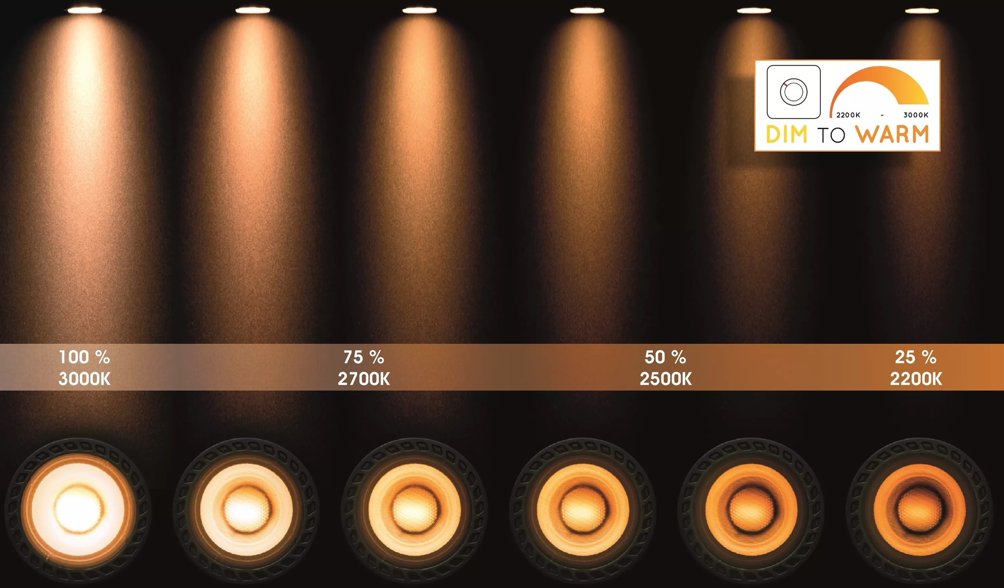 Cette ampoule GU10 12W dim to warm donne 3000 Kelvin à pleine puissance et lorsque vous la diminuez, la couleur de la lumière passe à la couleur chaude de la bougie 2200K. Une lampe puissante et une lampe d'ambiance en un.