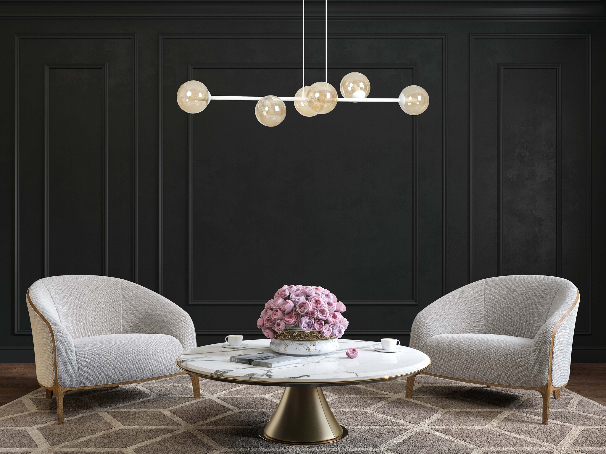Belle suspension Lejre blanche 6 lampes E14 moyenne avec 6 ampoules de couleur ambre