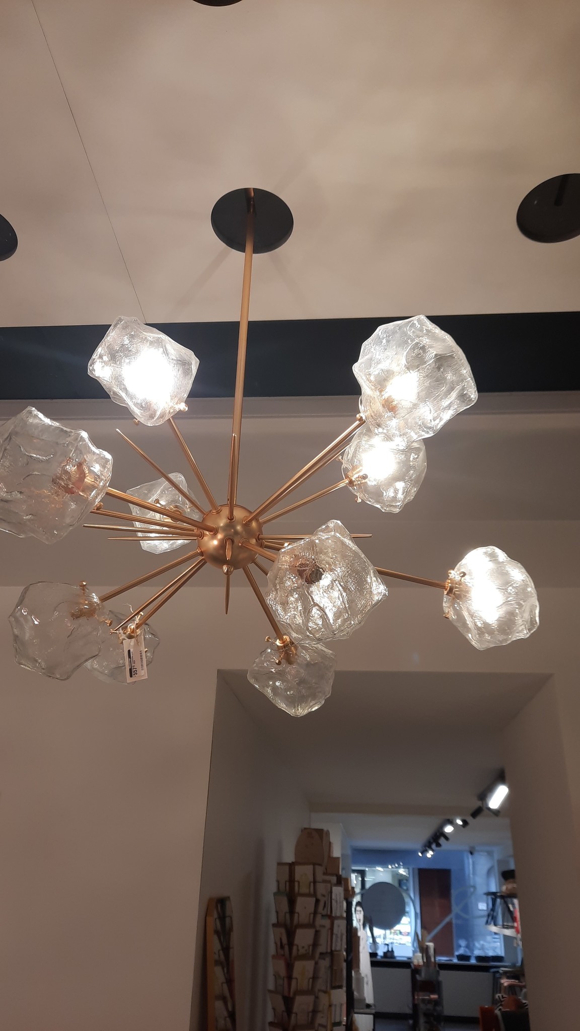 Conception d'étagère supérieure! Vous pouvez désormais acheter cette suspension d'exception à 12 bras G9 chrome avec verre chez Myplanetled. Ceci est disponible en chrome avec verre et or avec verre. Attire vraiment l'attention dans n'importe quel intérieur. Des blocs de verre sont montés aux extrémités.