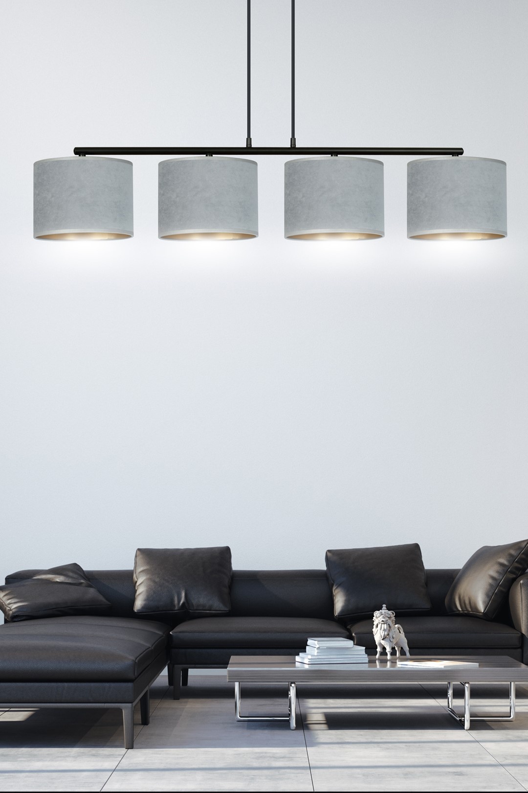La lampe suspendue HILDE 4 BL GRAY est un magnifique exemple de design minimaliste. Avec une combinaison d'acier revêtu de poudre et d'un abat-jour en tissu, cette lampe offre à la fois fonctionnalité et style.