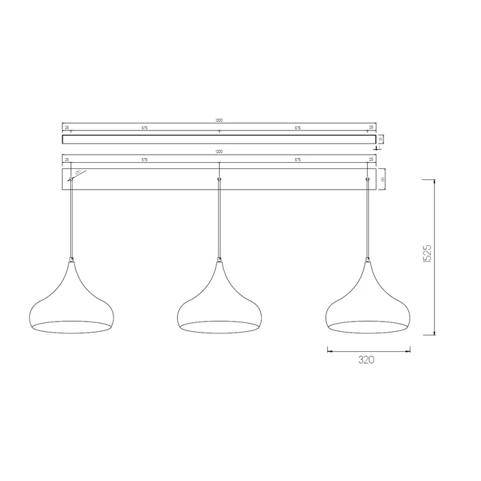 Spécifications d'une jolie lampe suspendue longue (120 cm), 3 gouttes noires de 32 cm de large chacune :