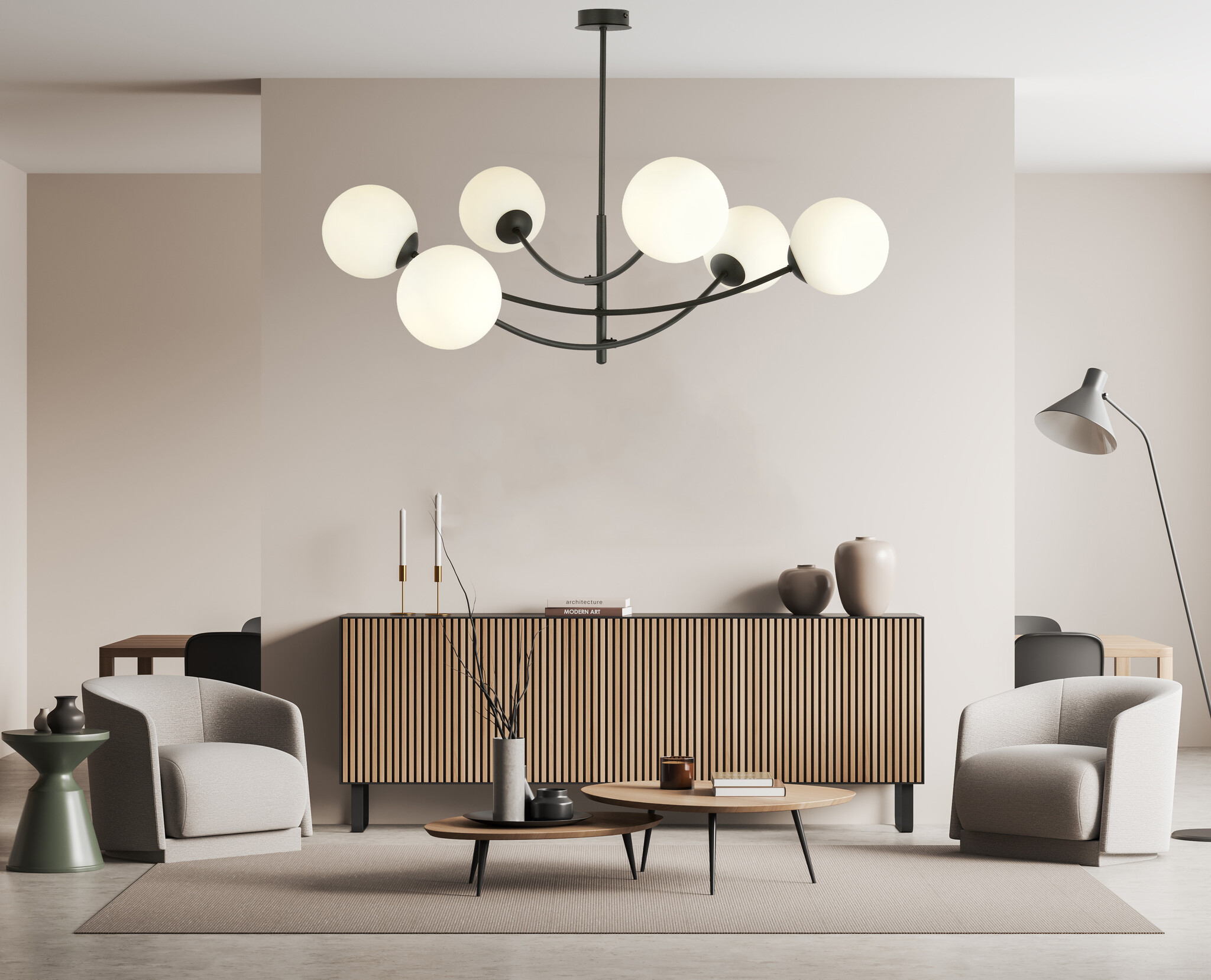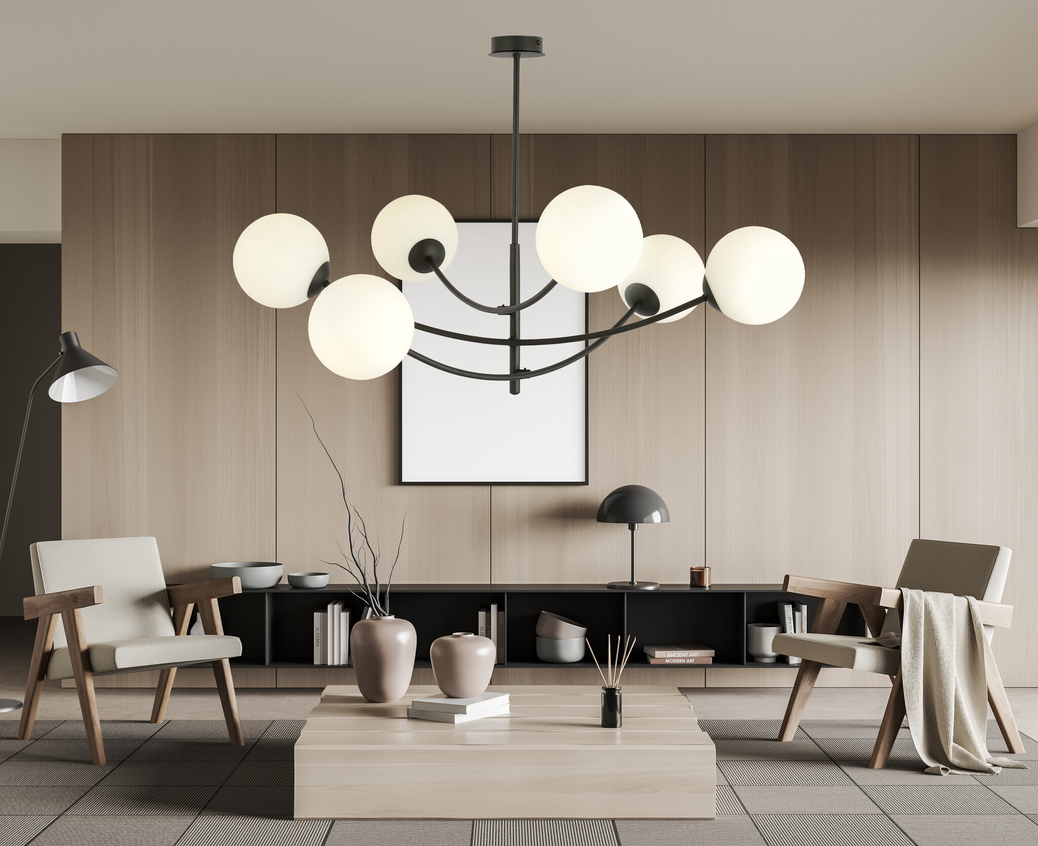 Lampe suspendue 6 bras courbés verre opale noir et blanc E14
