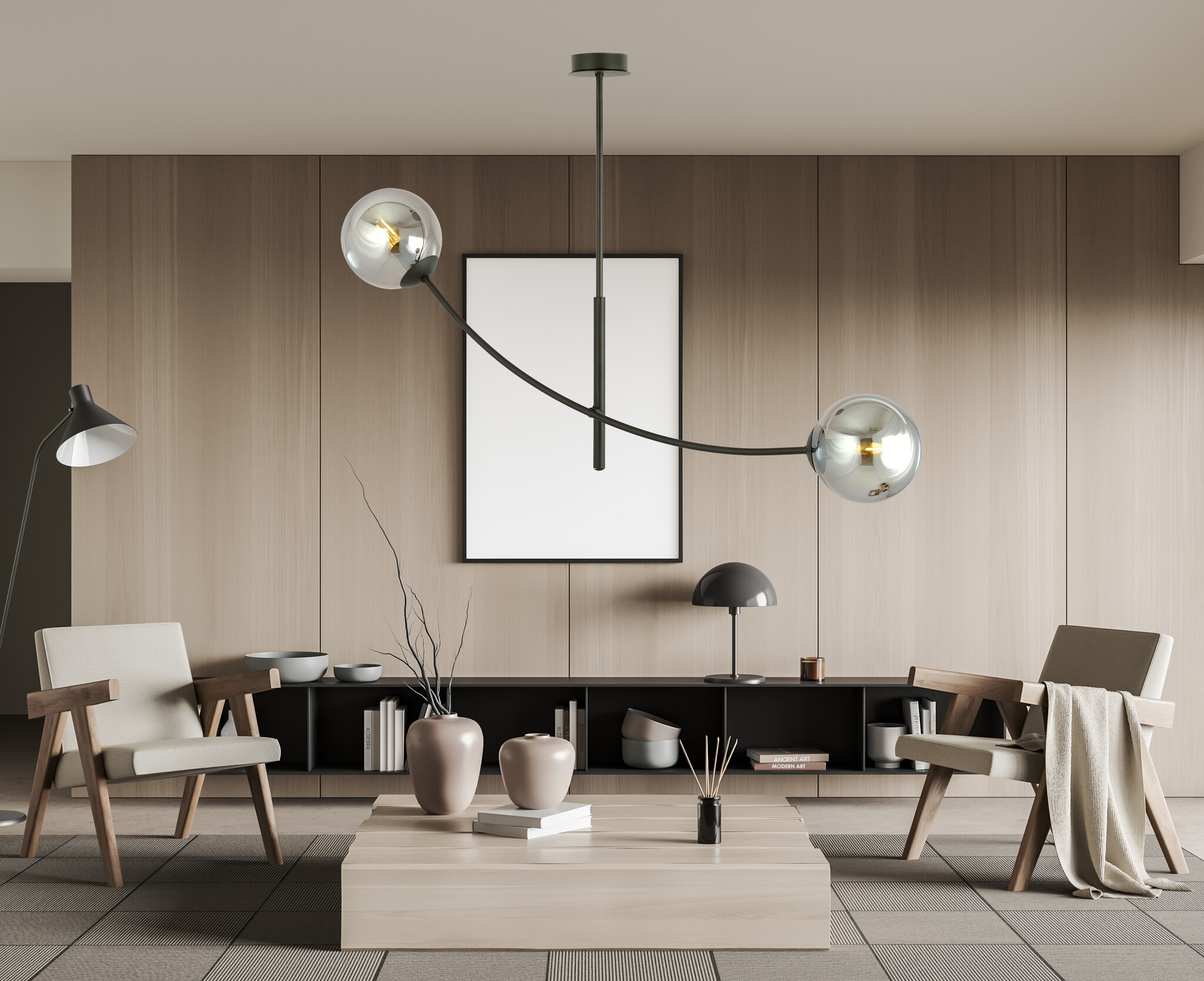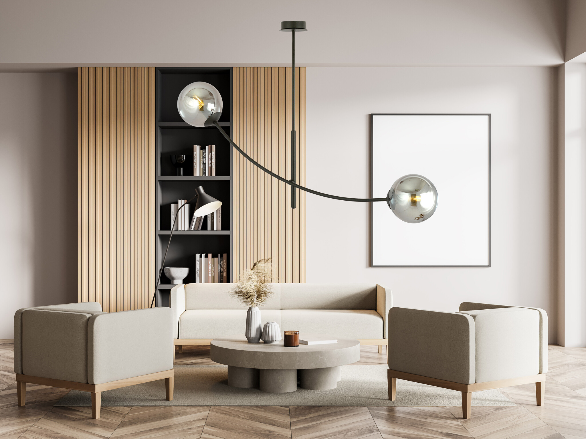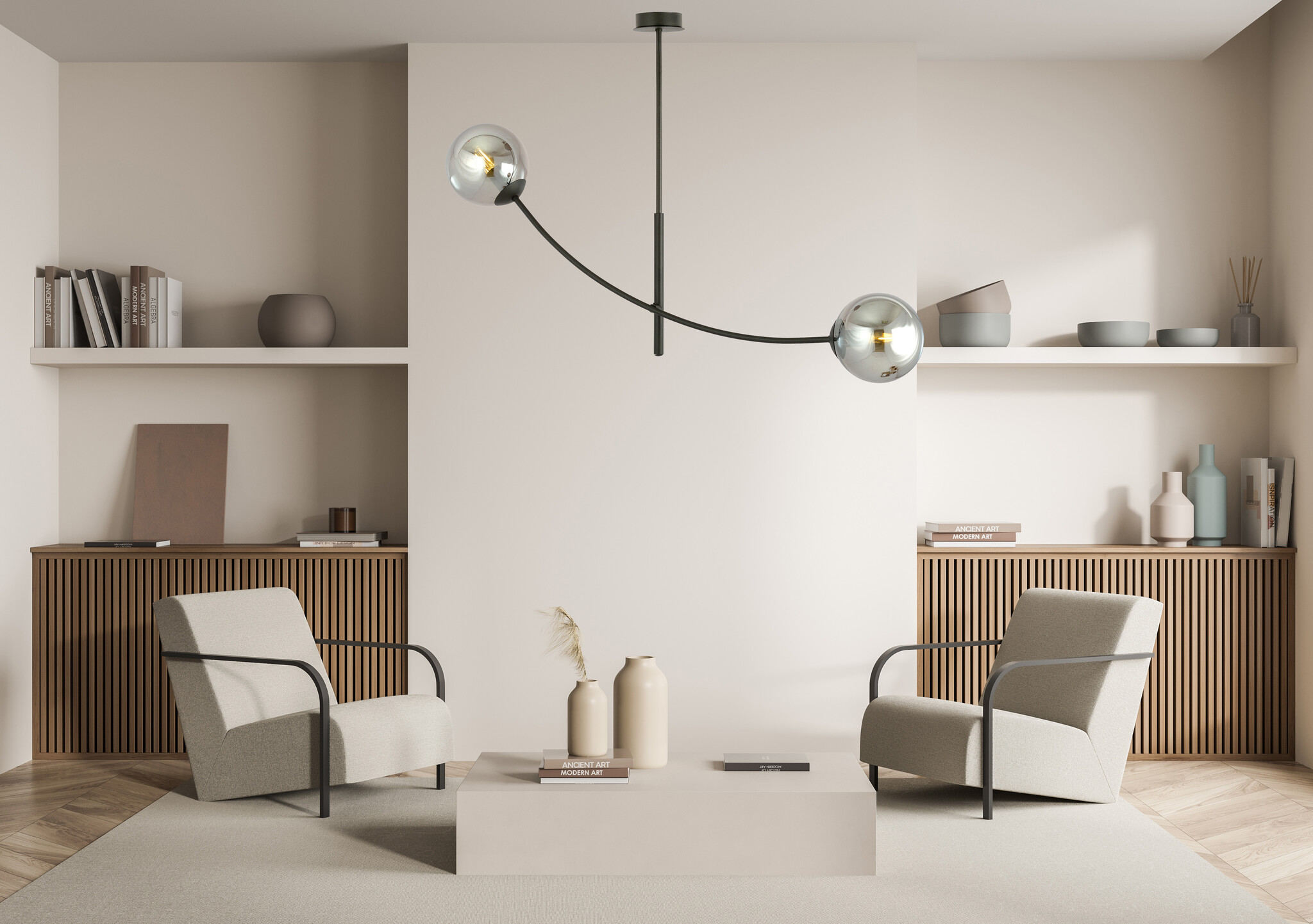 Lampe suspendue noire avec 2 bras courbés et ampoules fumées E14