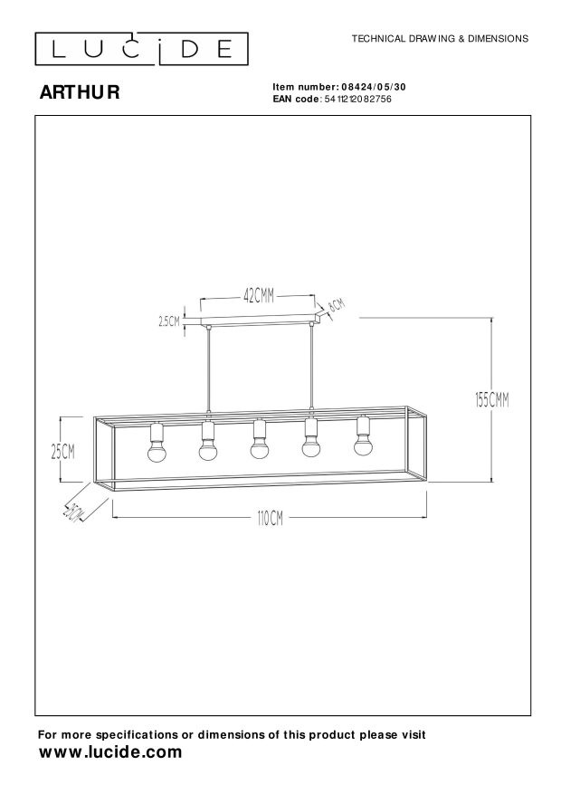 Spécifications Lucide ARTHUR - Lampe suspendue - 5xE27 - Noir :