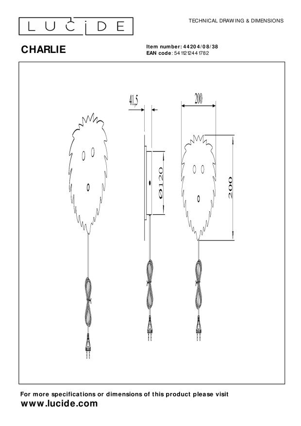 Spécifications Lucide CHARLIE - Applique Chambre d'enfant - LED Dim pour réchauffer - 1x7W 2600K/2700K - Beige :